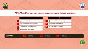 Group A includes Mamelodi Sundowns (South Africa), Lesotho Defense Force (Lesotho), Double Action Ladies (Botswana) and Wanderers LFC (Eswatini). As for Group B, it is made up of three clubs, namely Green Buffaloes Women (Zambia), Black Rhinos (Zimbabwe) and Tura Magic FC (Namibia).