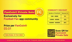 And now FanCoin® is available for the Football Fan app community and stakeholders to purchase in the private sale ending on 31st October 2022. FanCoin® is priced at £0.01 per FanCoin® and community members can also buy them at a bulk purchase discount ranging between 5% – 20%, for a limited period only. FanCoin® private sale can be accessed via https://footballfanapp.com/fancoin-private-sale .