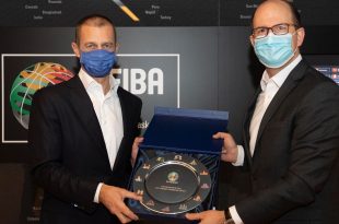 UEFA President Aleksander Čeferin and Andreas Zagklis, Secretary General of the Federation of International Basketball …