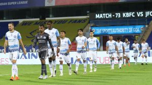The game kicked-off with pace as both sides went at each other, but Jamshedpur FC was seen with the majority of ball possession. Just as the match entered the 10th minute, Jamshedpur FC got a chance to take an early lead; Albino Gomes (Kerala Blasters’ goalkeeper) did not put the required amount of energy to clear the ball away to safety and the ball was collected by Valskis just a few yards away from the half-line. The former Golden Boot winner then tried his luck from far with a powerful low shot at goal which got blocked by the keeper. Even though Albino couldn’t get his full glove on the shot and the ball almost entered the goalline, it deflected off the post. After a close chance to take the lead, Jamshedpur FC came through with even more attacks to net an early lead over the hosts.