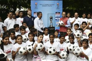 Indian Union Minister for Youth Affairs and Sports Shri Vijay Goel provided a unique opportunity to slum children from across Delhi today to witness the FIFA U-17 World Cup trophy displayed at his residence. The children were also gifted footballs during the event.